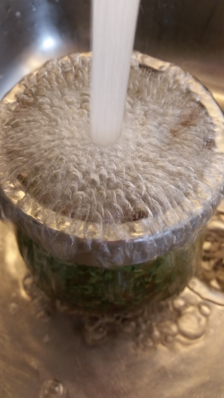 Det er ein fin prosess å spire på kjøkkenbenken. Den skal eigentlig stå i eit skap, men vi har ingen tomme skap i min høgde som den kan stå i. Det fungerte fint at den stod ute. Medan det spirer (eller heilt til det vart tomt for min del) skal det skyllast to gonger dagleg. Det går mengder med vatn!